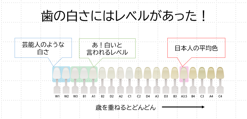 従来のサロンホワイトニングは数回通われ平均半分くらいまでの明るさまで行く方が多いです。ただ一番右側の色の方は医療ホワイトニング4~5回お勧めします。かなり変化を感じる方が多いです。ご希望の方はご相談承ります。難しい方もいらっしゃいますので要カウンセリングになります。